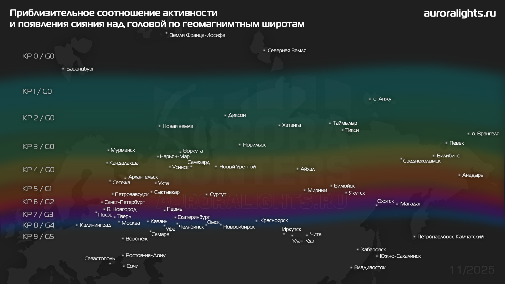 Примечание: мы считаем, что только отрицательный Bz межпланетного поля может указывать на активность. Таким образом, все положительные значения Bz соответствуют тихому уровню. Однако, если скорость солнечного ветра высока, геомагнитная активность на высоких широтах (66+) может быть даже при положительном Bz.